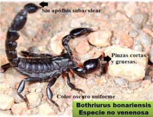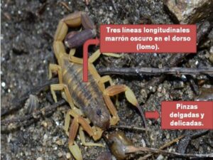 🔴 Los escorpiones venenosos presentan un color marrón claro o amarillento, tres líneas oscuras en el lomo, pinzas finas y delicadas.
